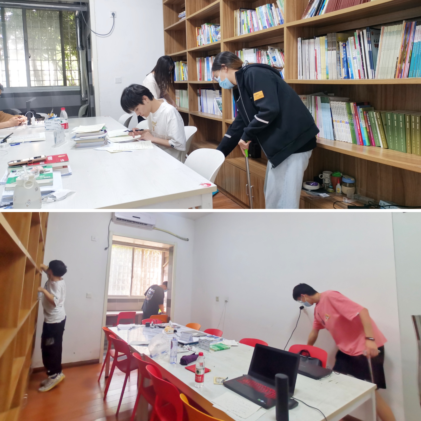 志愿者学生清扫书院一楼各个研学室。此次活动由唐臣书院书院管理办公室承办,旨在提高同学们的劳动素质与能力,维护书院日常卫生清洁。