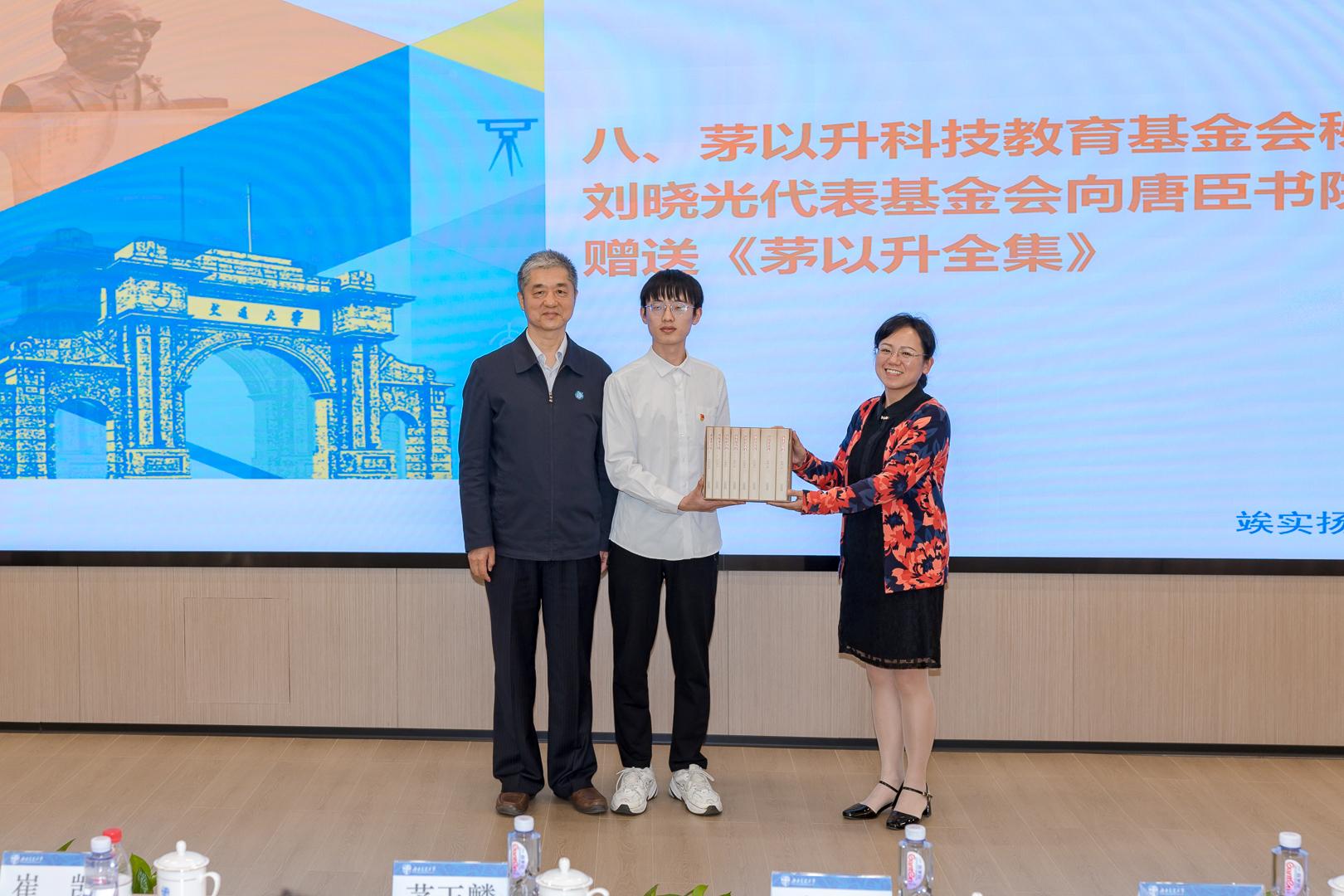 会上,茅以升科技教育基金会秘书长刘晓光代表基金会向唐臣书院师生赠送《茅以升全集》。