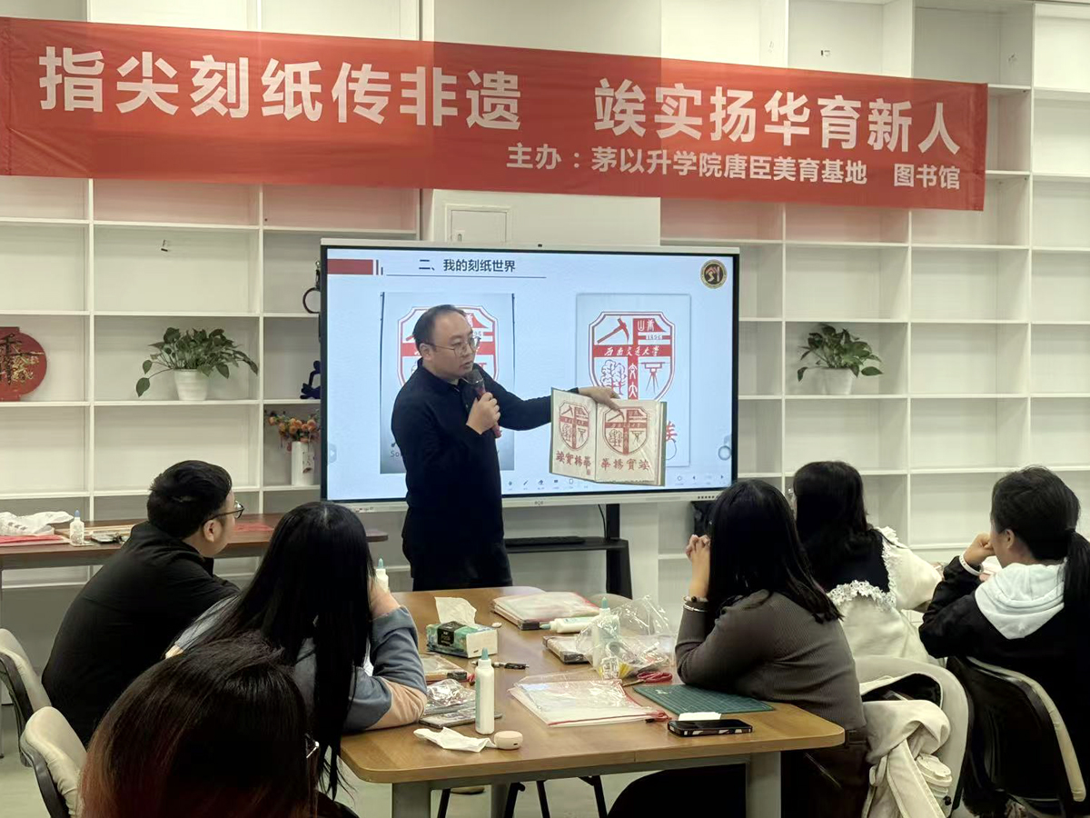 活动现场,杨宏毅以“一刀一纸一世界”为主题,以图文并茂的形式,深入浅出地讲解刻纸的历史渊源与核心技法——从纸张的甄选标准、刻刀的握姿,到线条勾勒的力度把控、纹样细节的处理技巧等,将这项非遗技艺的细节要点清晰呈现。同时,他结合自身学习刻纸的经历分享心得,并展示多件个人创作的刻纸作品,让学子们直观感受非遗技艺的独特魅力,现场兴趣氛围瞬间升温。