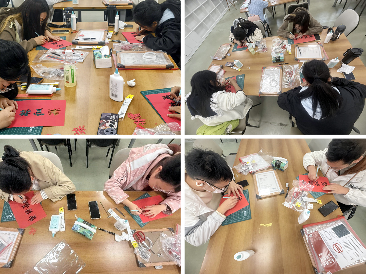 进入实践环节,同学们迫不及待地拿起提前准备好的刻刀、垫板,以印有交大精神“实扬华”字样的模板为参照,沉浸式投入创作。大家屏息凝神,专注调整刻刀角度,细致处理笔画转折处的细微纹路,遇到技巧难题时便相互交流探讨。杨宏毅则穿梭在学生之间,逐一观察大家的操作手法,及时纠正错误姿势,针对刻刀卡顿”“纹样变形等常见问题现场示范,耐心解答每一个疑问,让学子们在实践中不断改进技巧。随着时间推移,一张张红纸在刻刀下逐渐褪去多余部分,竢实扬华四个苍劲有力的大字慢慢浮现,原本普通的红纸瞬间变得富有生命力,成就感与自豪感在每位学子的脸上绽放。