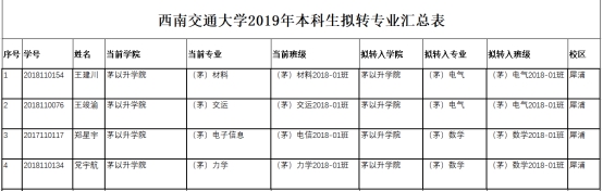 根据《西南交通大学本科生转专业管理办法》文件规定和西南交通大学茅以升澳门六合彩官网 2019年转专业的整体工作安排,经学生本人申请,澳门六合彩官网 考核,拟同意以下同学转入相关专业学习,并将相关事宜通知如下: