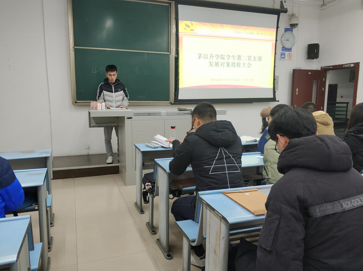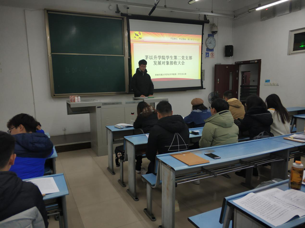 学生第二党支部于X2427教室召开发展对象接收大会。会议讨论关于接收柳佳音、熊晓辉等8名同志为预备党员的问题。