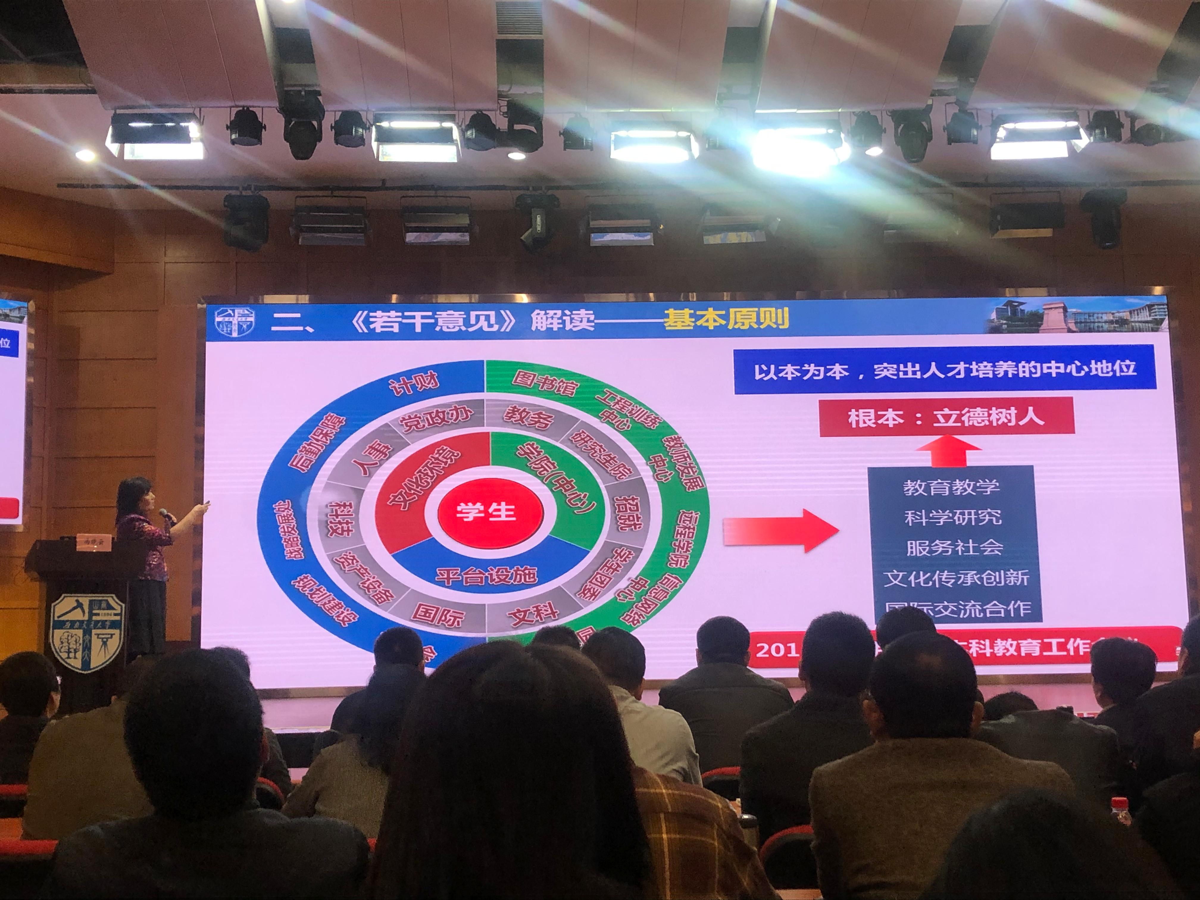 随后,冯晓云同志围绕围绕习近平教育思想,就新时代下西南交通大学人才培养要求进行了阐述。她指出,新时代下应以建设中国特色、世界水平高等教育强国为总目标,要抓好建设德智体美劳全面发展的社会主义建设者和接班人的教育根本目标,创建一流大学。