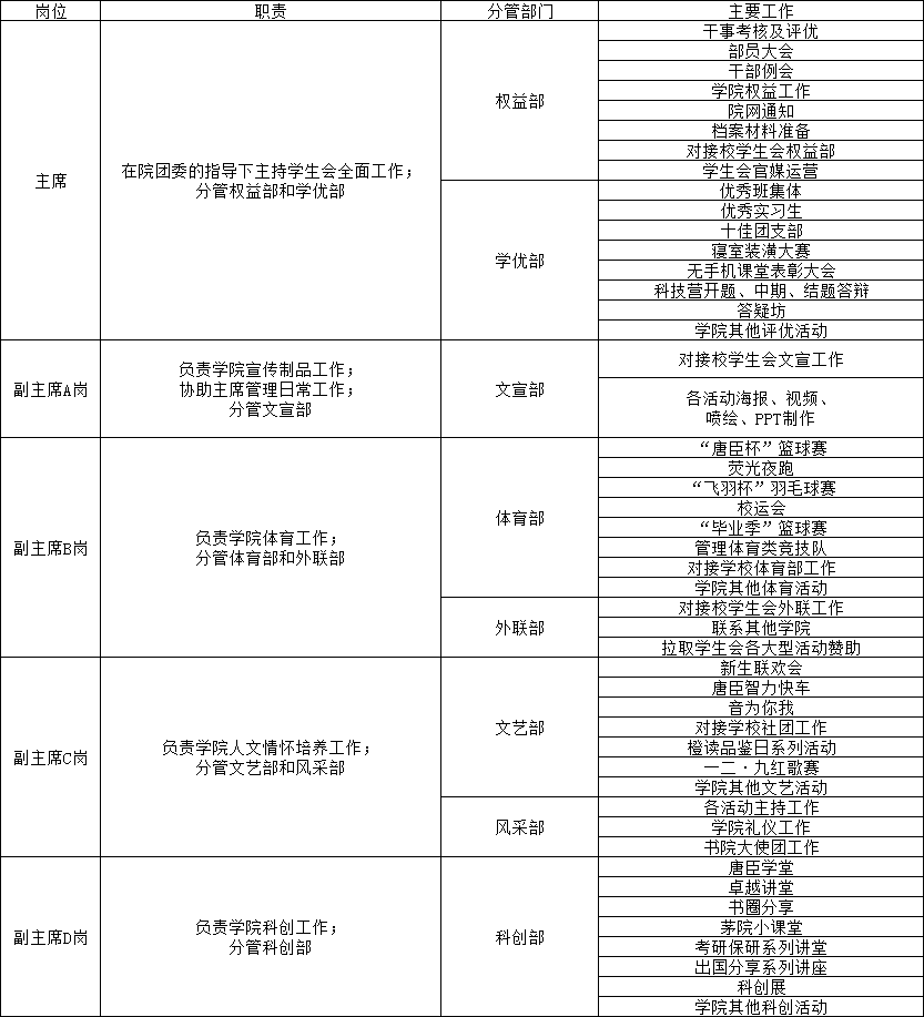 3.考核测试:本次应聘考核主要方式为面试。主要考察学生干部对学生会整体工作思路,以PPT形式陈述5分钟,回答提问3分钟。考核测试在学生会换届大会上进行。