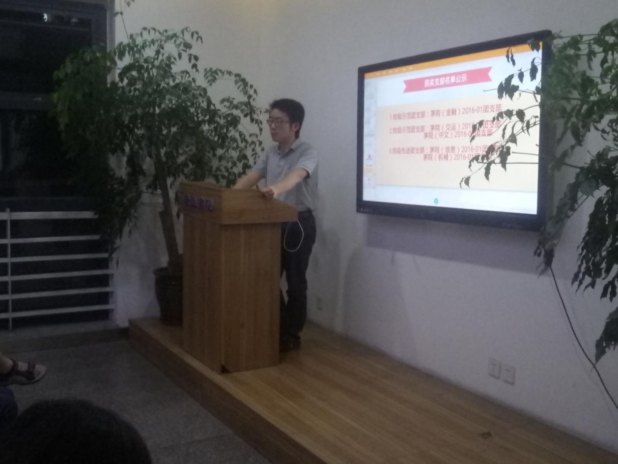 随后辅导员田弘长老师为表现优秀的团支部颁奖。其中获得院级示范团支部荣誉称号的有茅院(交运)2015-01团支部、茅院(中文)2016-01团支部;获得院级先进团支部荣誉称号的有茅院(信息)2016-01团支部、茅院(机械)2016-01团支部。