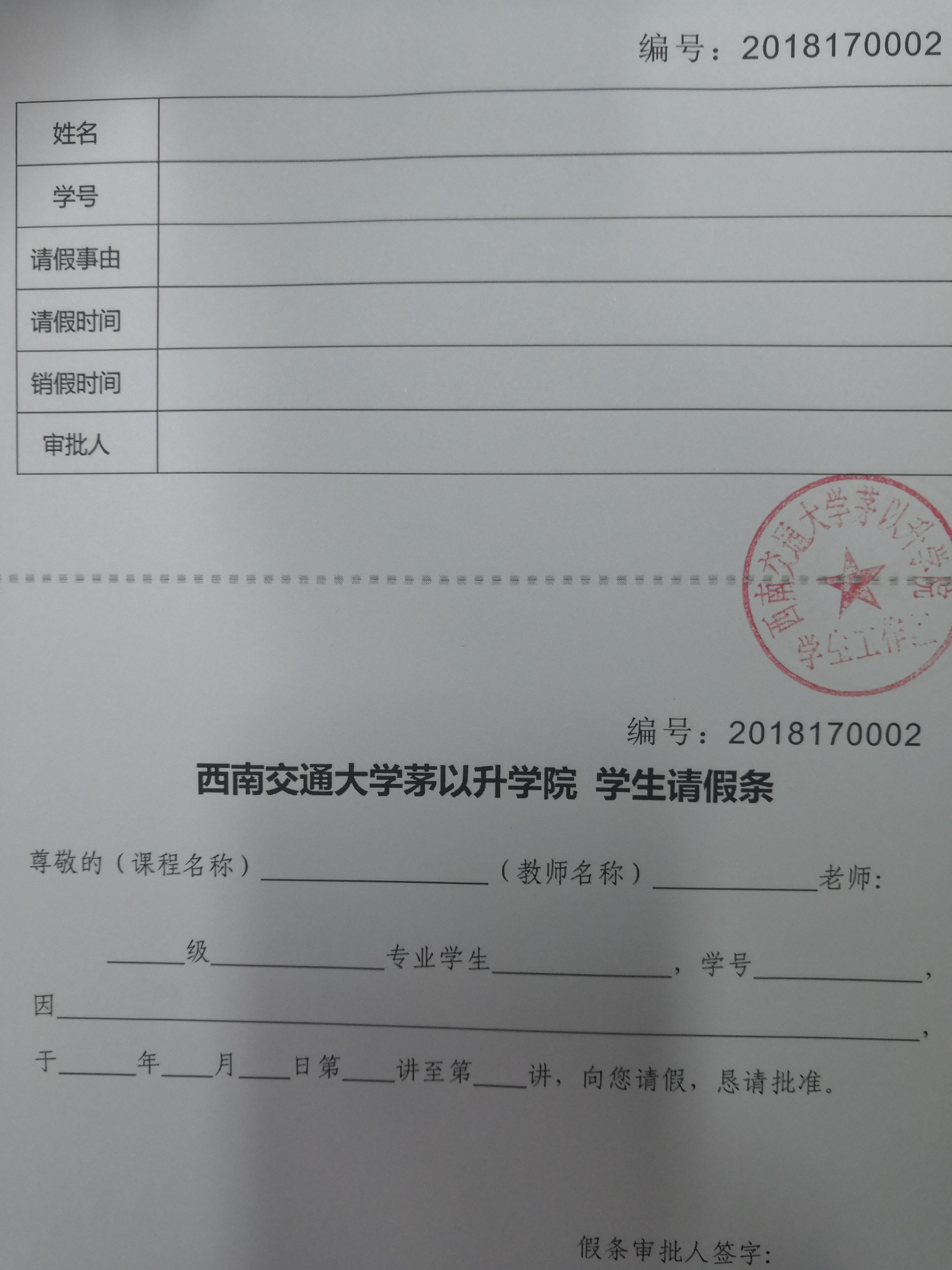 2 经相关辅导员审核,签字确认并加盖学生工作组骑缝章方可生效,每张假条有年级编号和独立编号;