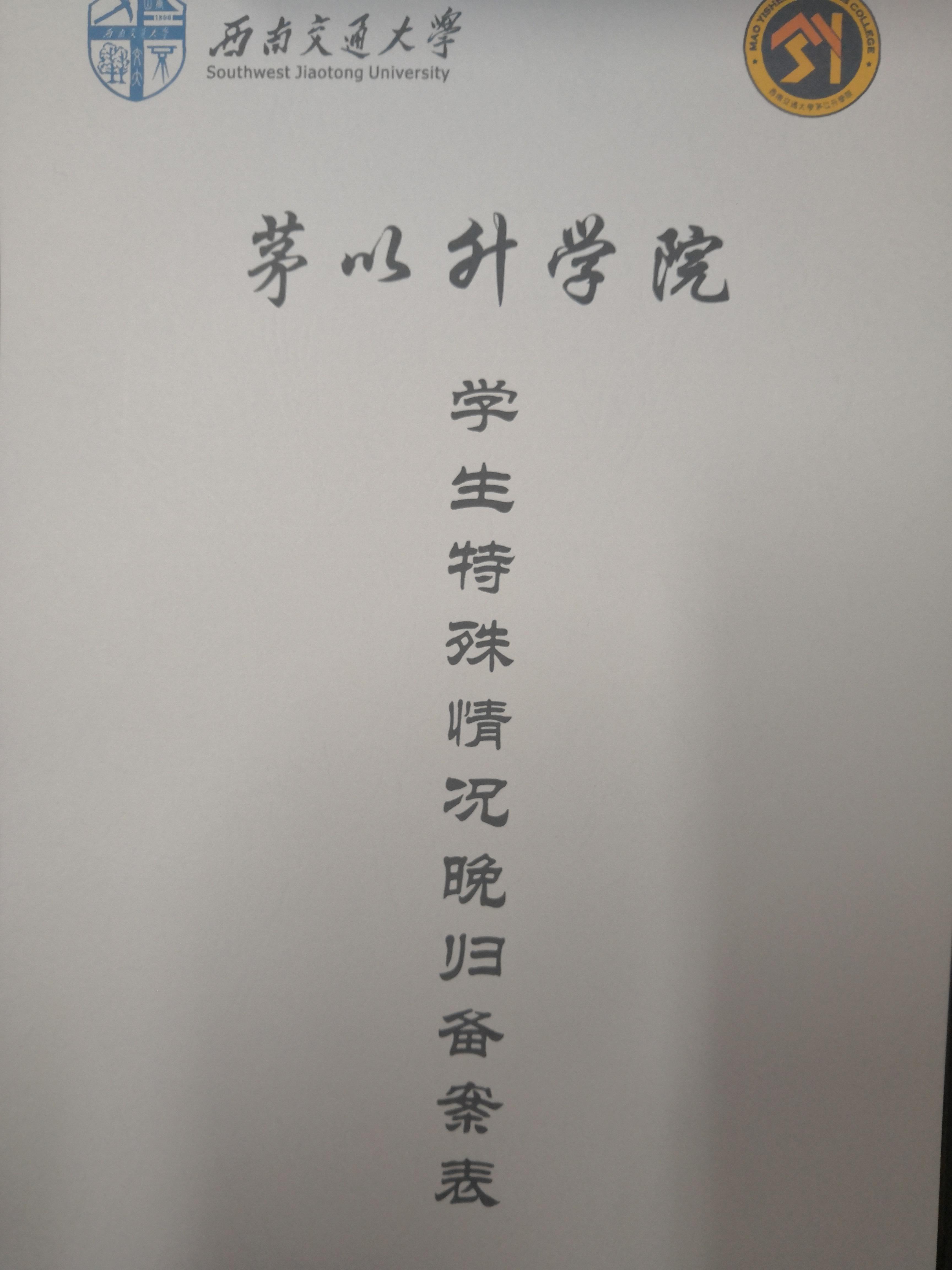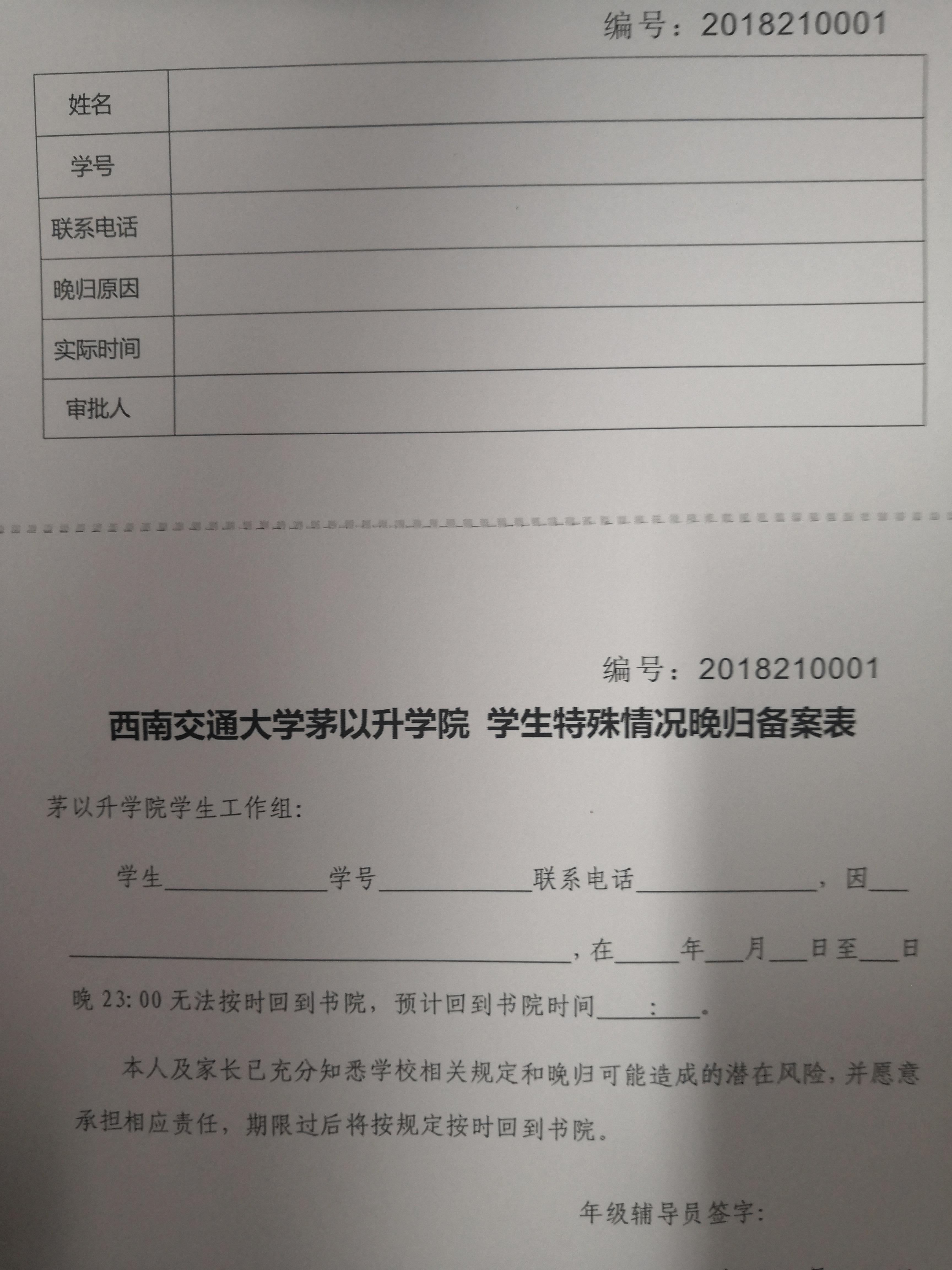 学生特殊情况晚归备案表》,方法同请假条。经年级辅导员审核,签字确认并加盖学生工作组骑缝章方可生效,交还书院田老师及书院事务办公室备案,方不再计算备案时段晚归次数;如有突发事件需要补备案表的,请在事发后一天内补,过时无效。