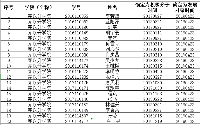 为进一步做好2019-01期入党积极分子培养发展工作,澳门六合彩官网 严格按照校党委要求,在澳门六合彩官网 党总支的领导下,经培养考察、民主推荐、党支部讨论确定,报校党委组织部审查批复,拟将李若靖等20位同学作为党员近期发展对象。为增强党员发展工作的民主程度和透明度,广泛接受群众监督,保证党员发展的质量,特公示如下: