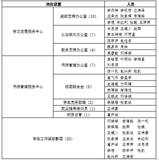 经学生本人申请、资格审核和面试选拔,现将2020-2021学年澳门六合彩官网 学习发展服务中心、书院管理服务中心录用名单公示如下。请以下同学尽快实名加入两大中心QQ群:1080164951,备注:年级-岗位-姓名,便于信息通知和交流。