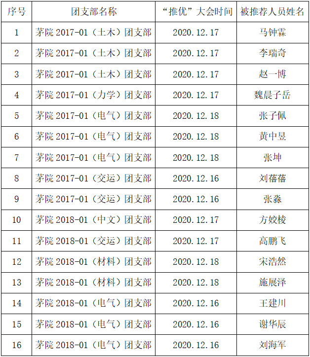 共青团组织积极向党组织推荐优秀团员青年作入党积极分子是“党建带团建,团建促党建”工作的重要切入点,是党对共青团提出的具体要求,也是共青团作为党的助手和后备军的具体体现。为使“推优”工作规范化、透明化、公开化,特将2020-02期“推优”名单公示如下: