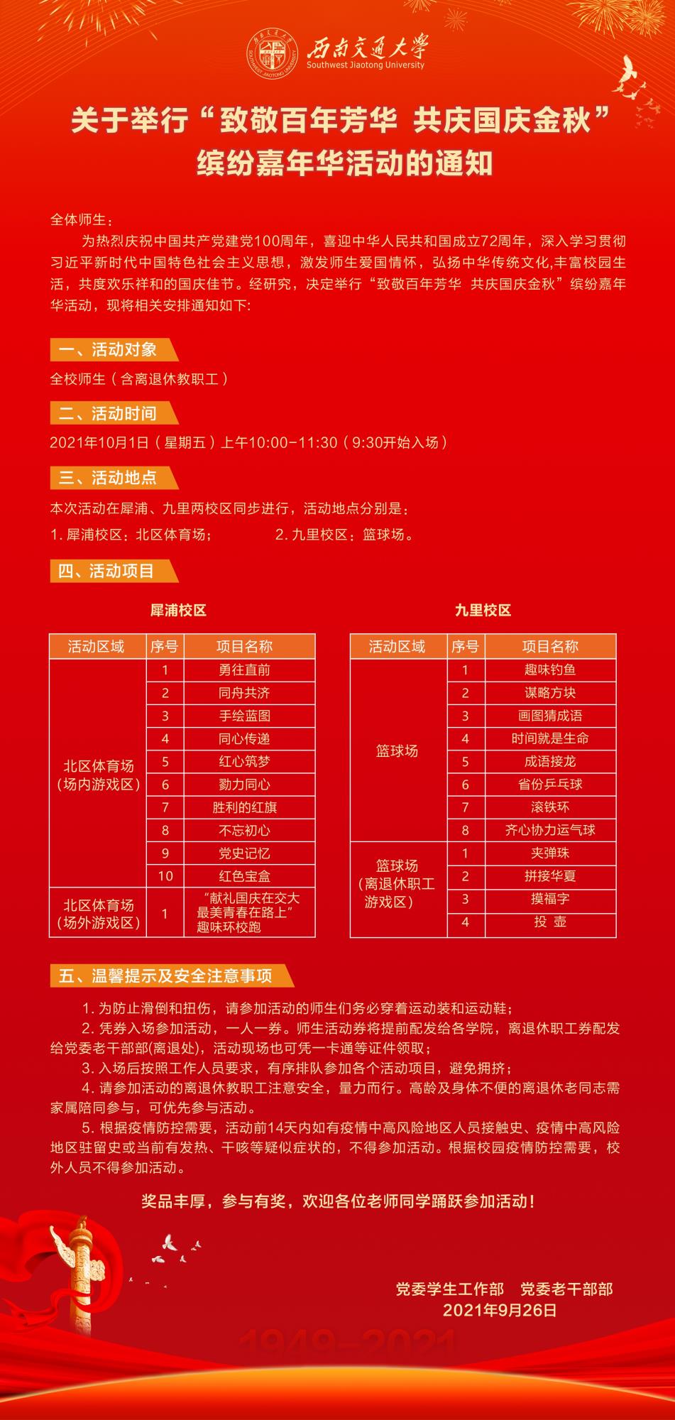 三、学生工作部“致敬百年芳华,共庆国庆金秋”缤纷嘉年华系列活动安排
