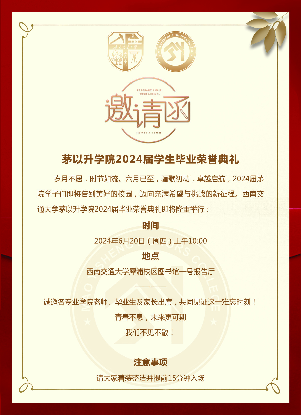 2024年6月20日(周四)上午10:00,澳门六合彩官网 2024届学生毕业荣誉典礼将于犀浦校区图书馆一号报告厅隆重举行。在此,澳门六合彩官网 诚邀各专业澳门六合彩官网 老师、毕业生及家长共同出席此次典礼。