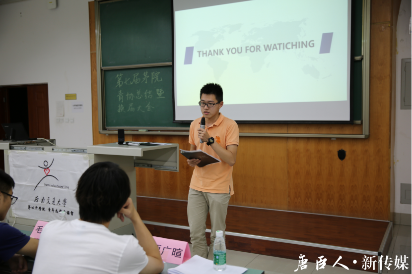 青年志愿者协会第七届会长栗广暄同学进行工作总结,并对未来工作进行展望。栗广暄同学首先对过去一年中青协举办的各项活动进行了回顾,并对各部门的具体工作进行了列举和总结归纳。同时他也针对在茅院团学组织调整中青协职能的变化,对接下来的工作提出了建议。在最后,他对青协的未来表达了自己的期望。