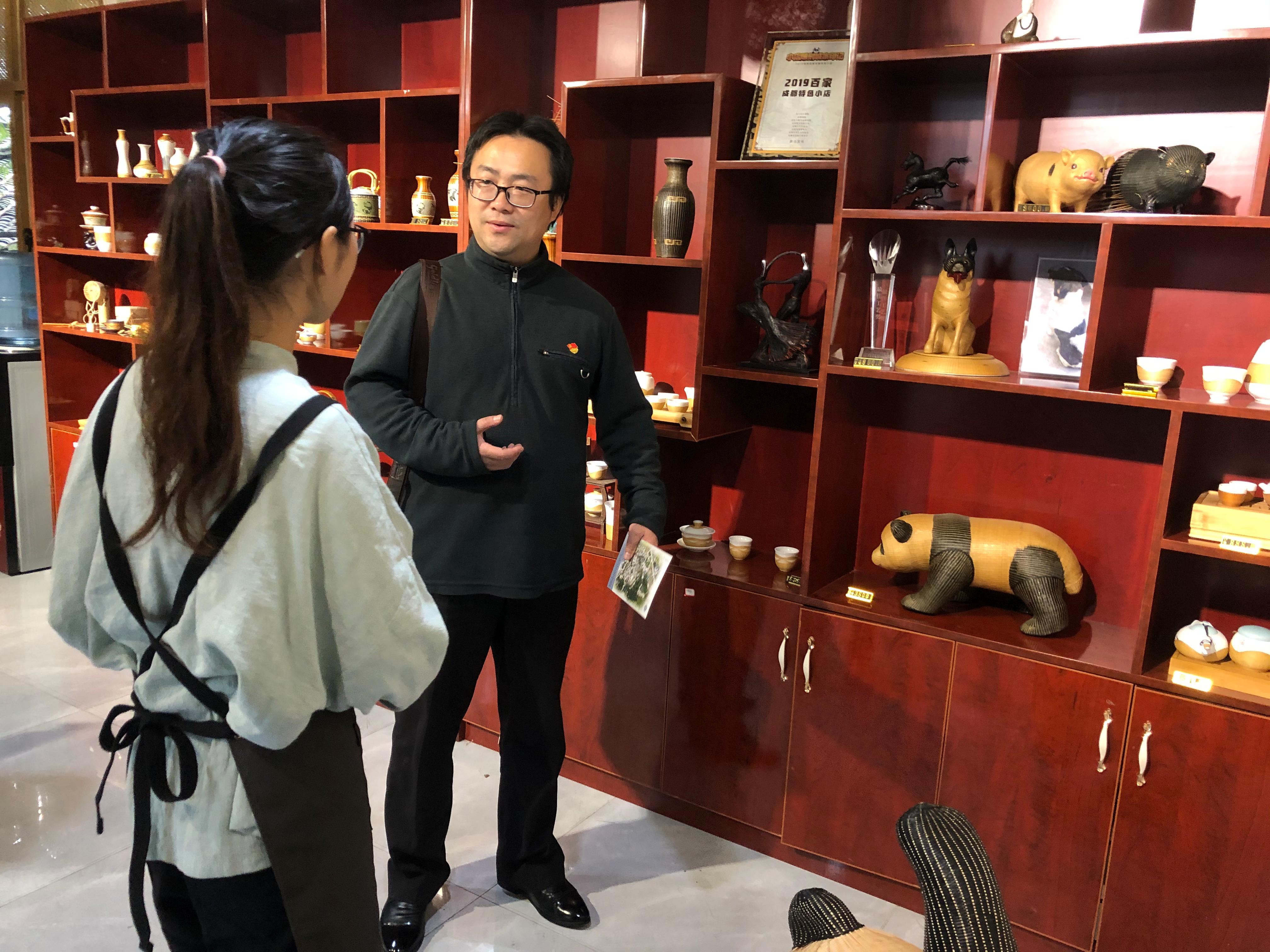 在红梅竹编工作室,甘霖书记与竹编艺术非遗传承人王红梅的女儿——90后女孩肖遥进行了交谈,据她介绍,母亲王红梅是是道明镇土生土长的竹编艺人。上世纪90年代中期,由于现代化工业的发展,道明竹编逐渐萧条,但她始终没有放弃,反而多方学习,探索竹编技艺。正是因为这份坚持,后来也迎来了转机。2018年,她开起红梅竹编工作室,不仅批发和销售道明竹编,更培训了很多留守妇女,促进她们发挥自己的劳动力,带动村民的就业。如今,红梅竹编工作室成为道明镇竹艺村的竹编体验小店,目前每个月营业额在3万左右。