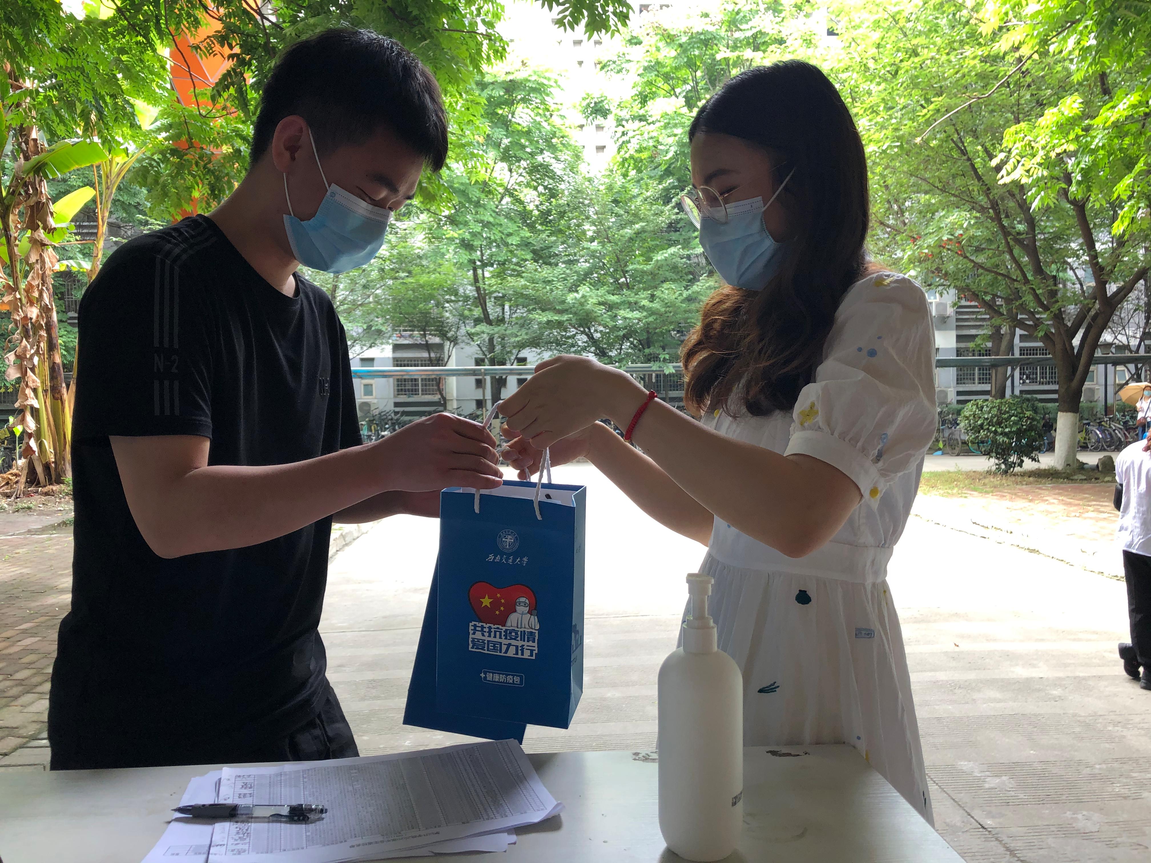 接待点,亲切问候每一位返校同学并答疑解惑,为返校学生进行二次身份核验、发放校院爱心防疫礼包,让同学们感受“回家”的温暖,爱心礼包里丰富的防疫物资也传递了学校和澳门六合彩官网