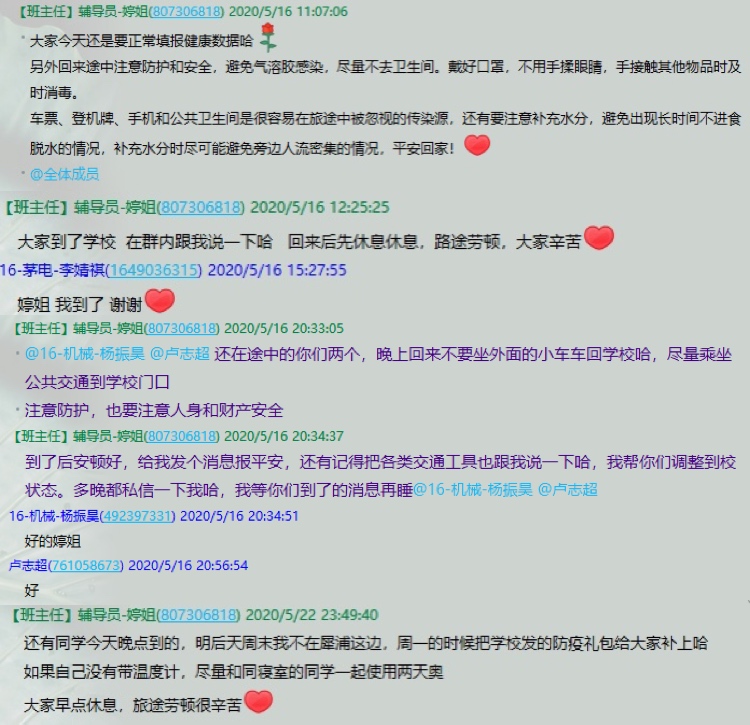通过落实每日健康监测,全面了解学生动态,做好信息摸排。并根据学校关于学生返校相关部署工作后,主动联系每一位毕业年级学生,了解学生需求及现状,针对性引导返校学生提交返校申请、领取“返校通行证”、准备返校物资等,妥善组织学生返校。