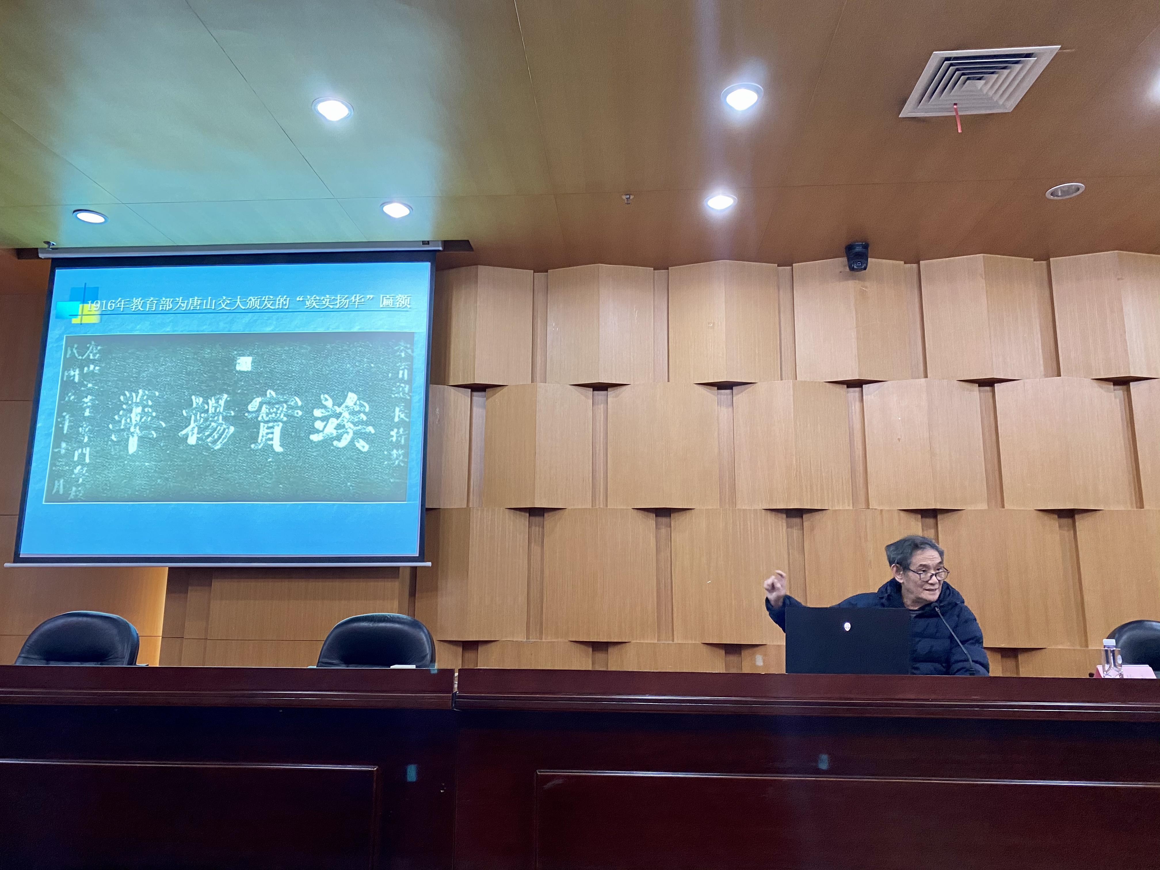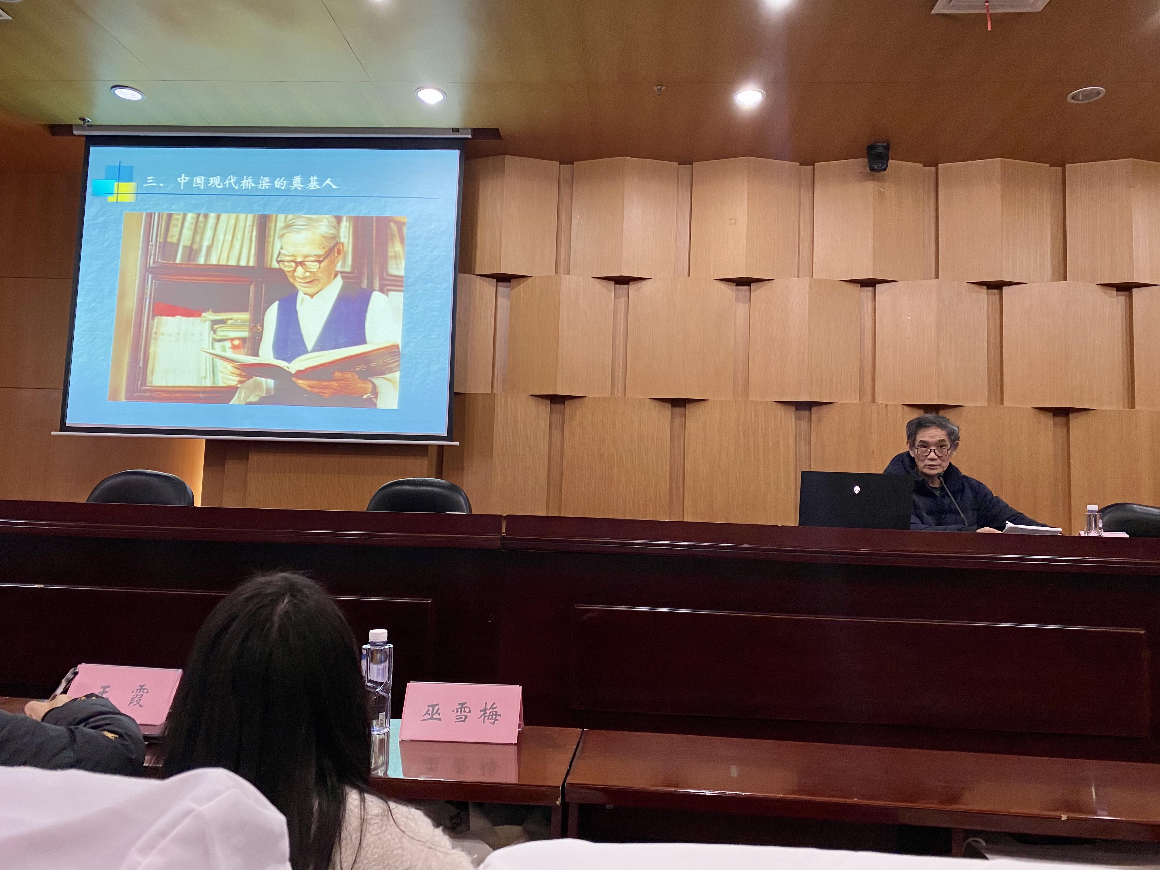 讲座的开始梁教授便介绍了茅以升精神的精髓:求真务实、脚踏实地,不畏艰难、献身科学,热爱祖国、热爱母校。然后,梁教授讲解了茅以升一生中的大致经历,并讲述了当时作为学生的茅以升为母校唐山交大赢得了第一块金字招牌——“竢实扬华”的故事。梁教授讲述道,茅以升曾先后四次担任我校校长。1937年,“卢沟桥事变”爆发后,学校决定迁校,当时我们学校没有校长。因此,在学校师生的请求下,当时正在政府任职的茅以升,辞职又回到母校当了校长。