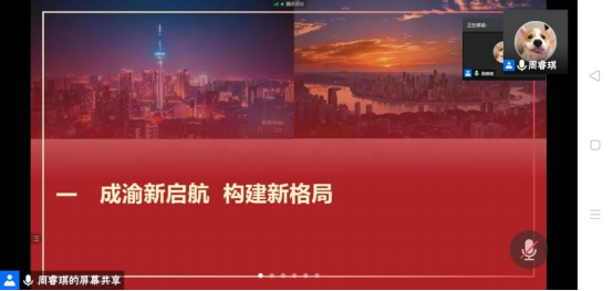 接着,团支部书记从“成渝地区双城经济圈”的战略意义、建设基础、建设渊源以及青年使命四个方面分别向大家介绍了成渝发展的现状和未来。生逢其时,重任在肩,助力建好“双城圈”,唱好“双城记”,是我们青年学子的时代使命,我们应当将个人理想与时代责任、国家建设紧密结合,练就过硬本领,做勇于创新的一代,让青春在为祖国、为人民、为民族的奉献中焕发出绚丽的光彩。