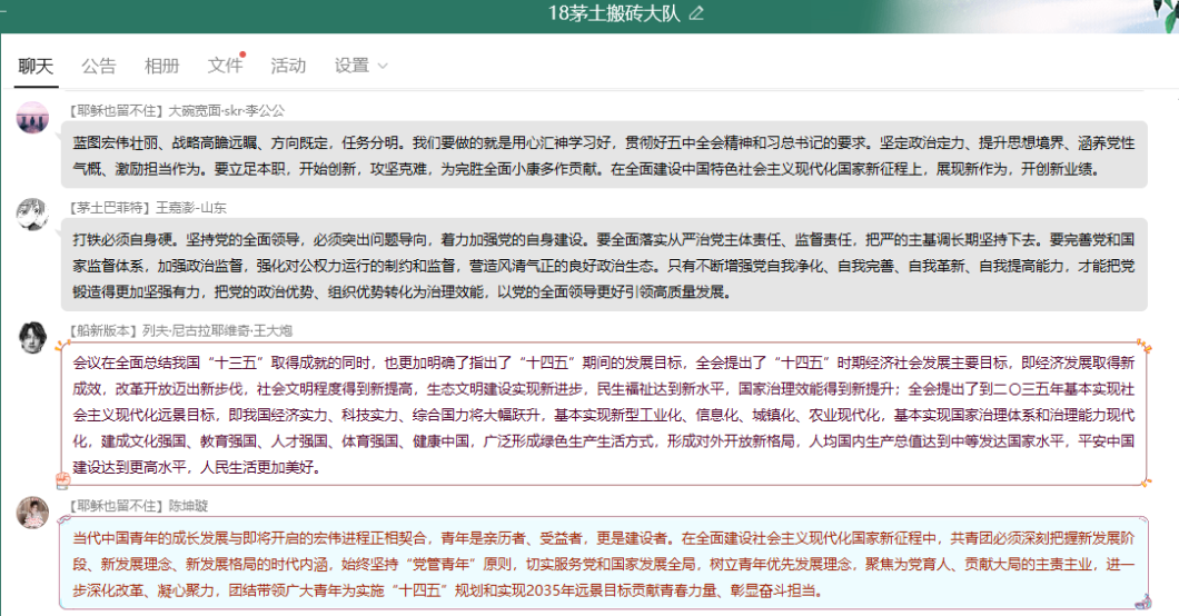 最后,大家在群内踊跃发言,分享了学习感悟,有的同学赞扬了中国当前所取得的成就,有的同学谈了谈中国目前遇到的困境,还有的同学也发表了自己对中国未来的信心,大家都受益良多。