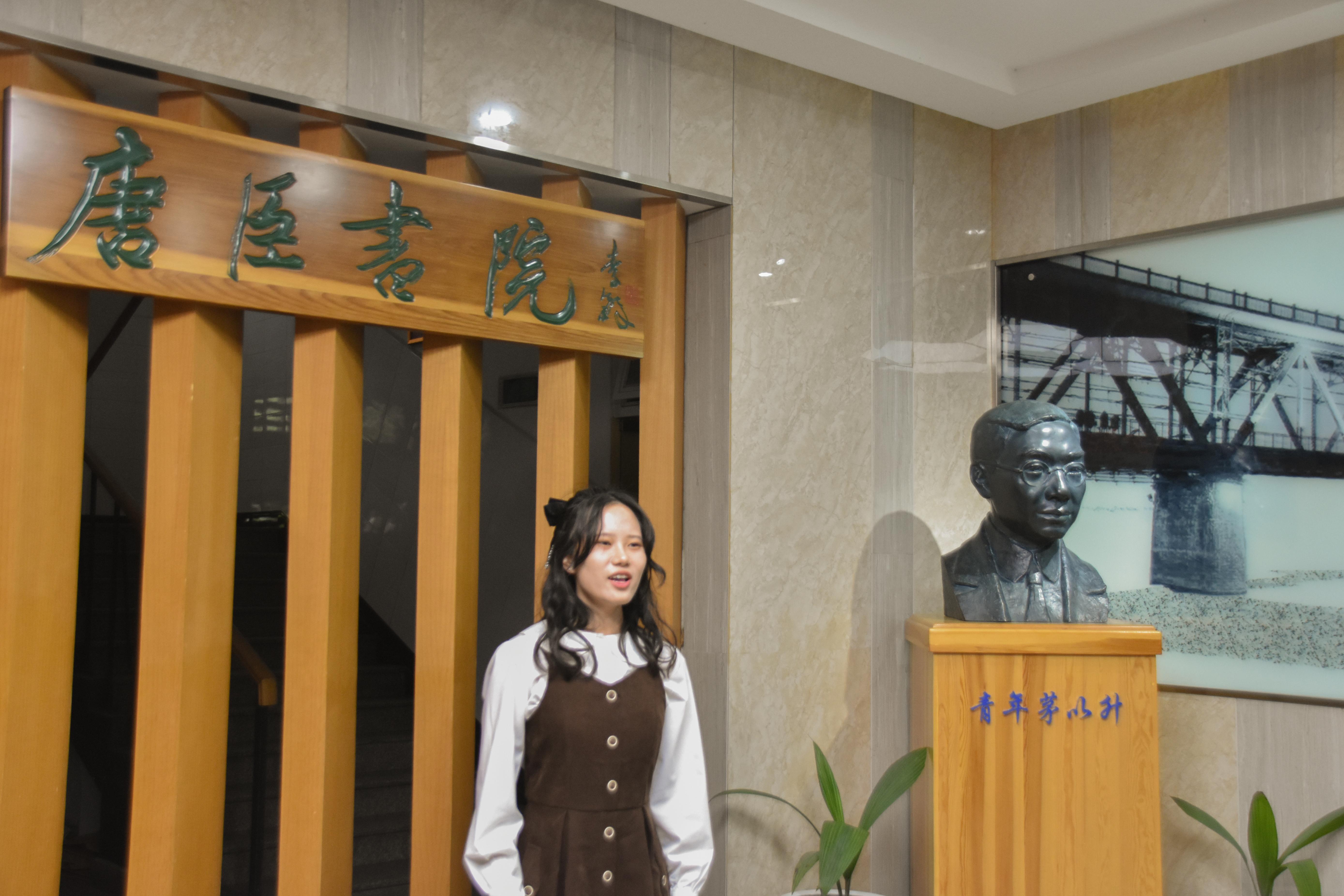 崔永康同学为大家朗诵诗作《七绝三首——别钱塘》,诗作者为茅以升老先生。我们熟知的“五行缺火真来火,不复原桥不丈夫”亦出自于此。茅老以激昂的笔调、阔大的笔法写下此篇,寄予自己浓烈的情感,读来令人震撼。“突破难关八十一,惊涛投险学唐僧”将茅老母亲曾言“唐臣造桥,八十一难”与相传唐僧取经八十一难相结合;“五行缺火真来火,不复原桥不丈夫”将“钱塘江桥”四字偏旁五行缺“火”与 1937年为阻日军不惜炸桥相系,“火”真来了,桥却断了……在崔永康同学声情并茂的朗诵中,我们仿佛置身历史之中,体会茅老的万千思绪。