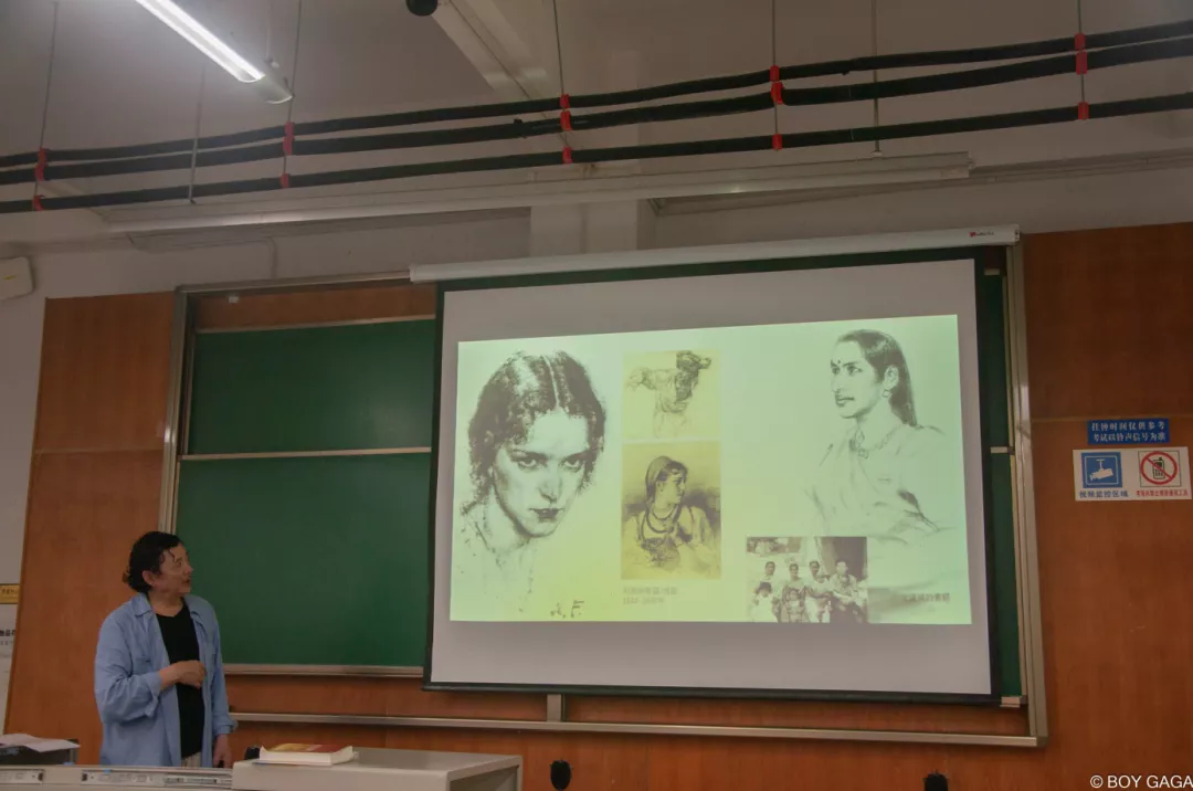 汪晓灵老师先是用多组相似题材的中国画和国外油画作品进行了比较,通过对名家作品的分析和对各种艺术角度的解读展现了中外著名画作的不同之处。接着,他又向大家展现了沈道鸿的水墨、素描人物头像和速写、手稿、色稿等作品,剖析了沈道鸿作画的习惯和独特之处。然后,他又列举出沈道鸿的藏族人物、印度人物和古代人物题材的作品进行分析,指出沈道鸿先生画技的过人之处。汪晓灵老师对每一幅作品,都进行了深刻细致的分析,他常用放大图画细节的方式,向大家阐释画作构图以及表达的不同之处,在动情之时,还会向大家描述他欣赏艺术画作时的心境和自己的经历。大家都被汪晓灵老师的讲授所吸引,陶醉其中。