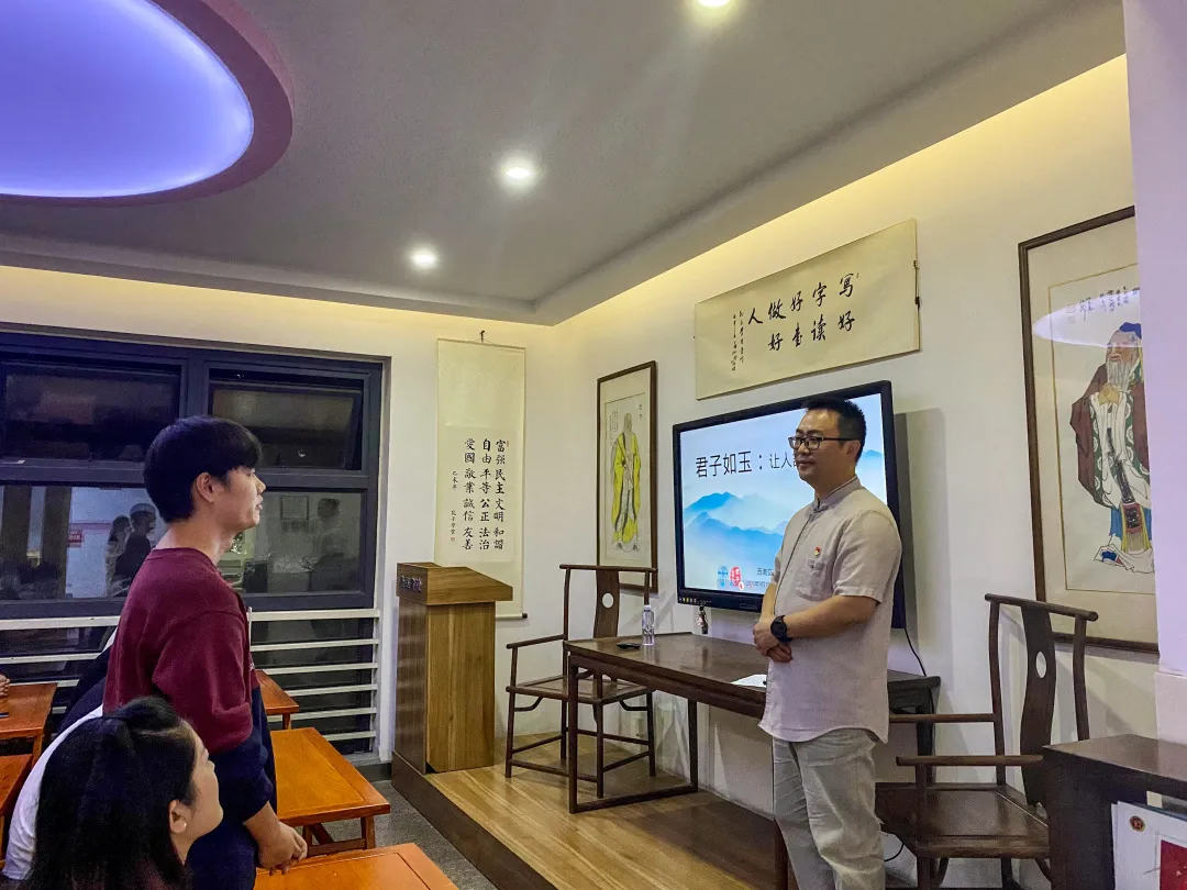 孔祥彬老师首先通过一幕短剧引出了今天的主题,向同学们介绍了今天的特殊意义——孔子诞辰纪念日。接下来,孔祥彬老师就主题中的 “君子”与“玉”,详细分析了君子五常——仁义礼智信、君子五德——温良恭俭让,指出孔子君子思想对人类命运共同体的深远影响。孔老师希望同学们在大学可以突破自我,磨练自我,向着美好人格努力,并回答了同学关于如何处理人际关系的问题。