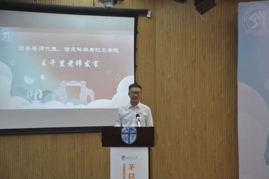 王千里老师发言,作为四年求学生活最亲近的人,班导师在同学们成长成才历程中扮演着不可或缺的角色,王老师激励同学们身处不确定的时代当中,做到“屯才,屯学,屯识,屯体”,增强自身能力和底气,勇担时代之梁。接下来,全体唐臣书院驻院导师带来配乐诗朗诵——《唐臣青年》,导师们掷地有声、字字铿锵,诵出了唐臣青年的向上风貌。