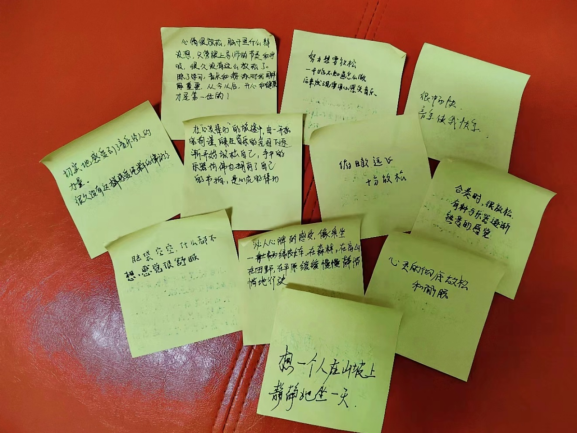 第四环节——解决之道,在温柔的旋律中,两组体验同学分别展开他人的纸条,针对别人的烦恼、焦虑,在空白一面用一句话写下自己的解决办法,然后投入心灵盒中;进入第五环节——重塑身心,甘老师演奏空灵鼓并对同学们进行心理引导,舒缓平和的音乐伴随着山间清澈的小溪声音和清脆的鸟鸣,同学们慢慢进入了半催眠状态,温柔和谐的音响沁入了耳鼓,静谧舒适的意境沉醉了心灵。甘老师温润磁性的引导语让同学们慢慢静心,倾听心跳,感受情绪。接着在第六环节——心动分享中,同学们将“心灵律动”的心动感受用一句话或几个关键词写在纸条上,在另一面用一句话写下自己最美好的心愿,然后投入心灵盒中并与大家一起分享。活动的第七环节为吟咏抒怀,在甘老师的带领下,同学们一起吟诵《蒹葭》,品其芳华,承其志向,共同领略诗经的意境与力量。