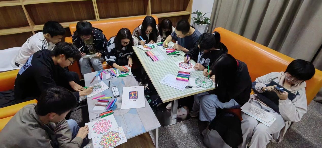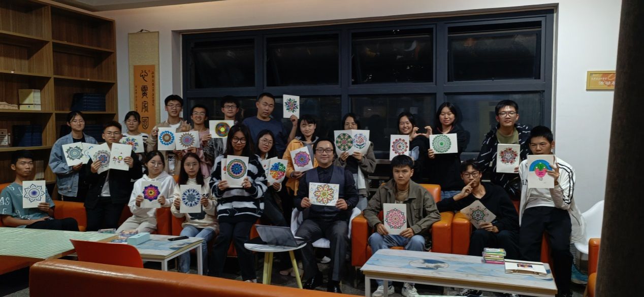 在最后的“心灵重塑”环节中,每一位同学都拿到了一张无色的曼陀罗画纸,在甘老师的指导下,大家都拿起画笔为这些美丽的花,填上独一无二的色彩,那是属于自己的心灵色彩。在一笔一划、一点一滴的勾勒中,感受心灵的整合、赋能与升华,通过线条、图形与色彩的连接,整理意识碎片、激发潜意识,构建自己的心灵小宇宙。
