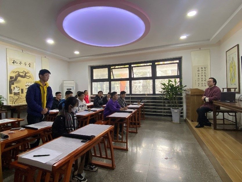 甘老师从中国文字的起源、书法的演变过程为同学们进行了详细的讲解,并以互问互答的形式与同学们展开讨论。通过书法讲座,为学生们解读了中国书法艺术在中国文化大系统中的重要地位与价值,让同学们了解中国书法艺术的深厚底蕴,感受中华文化千年积淀的厚积薄发。