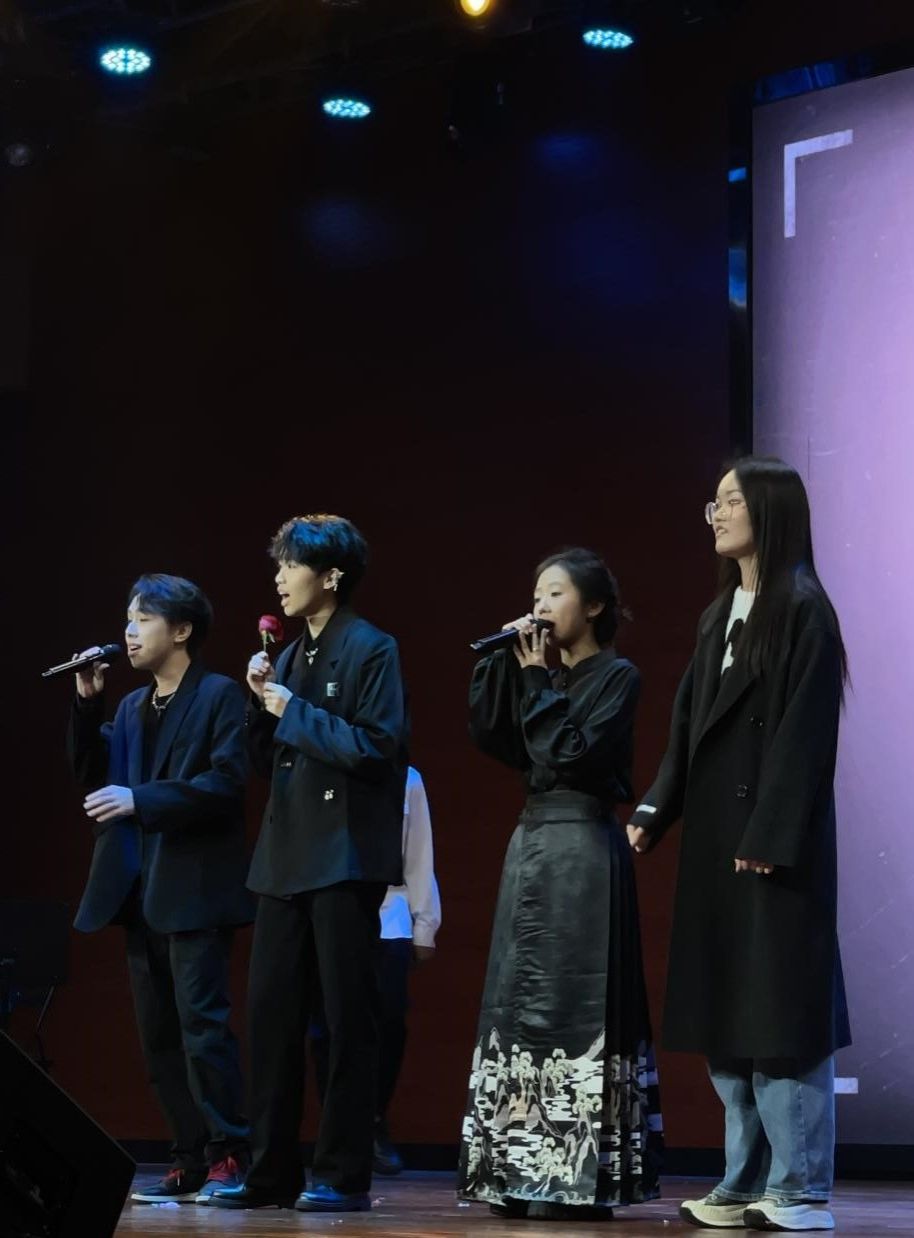 在第二篇章的开头,由高涵霖,李羽彤,廖柯琳,李睿,祝瑶烨五位同学带来了男女重唱《大鱼》——电影《大鱼海棠》中的主题曲,演绎着委婉优美的旋律,如一幅画卷徐徐展开,带着几分中国传统文化中的古典哀愁,平凡的韵律如诗一般直戳人心,脉动着瞬息万变的生命力如同天使一般,让人迷恋和沉醉于这美妙的意境中。