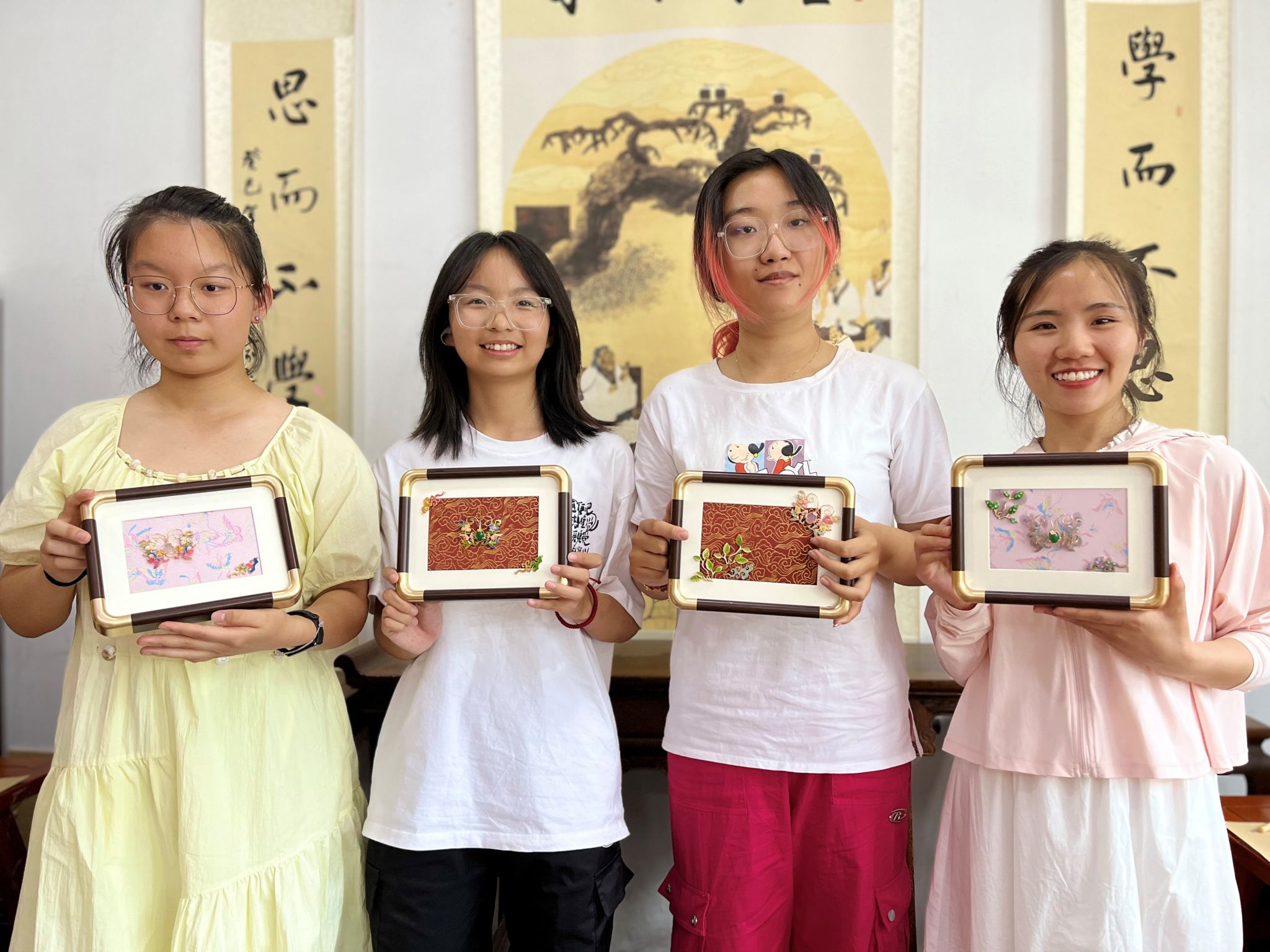 当一件件宋锦珐琅螺钿画作品诞生,同学们手持装裱好的成果合影,笑意里满是成就感。此次活动不仅是一次技艺实践,更是唐臣美育基地以民族传统艺术厚植文化热爱理念的生动落地——通过宋锦的典雅、珐琅的绚丽、螺钿的天然,让同学们更直观地触摸到中华传统工艺的多元魅力,在创作中完成对文化根脉的认知与亲近。