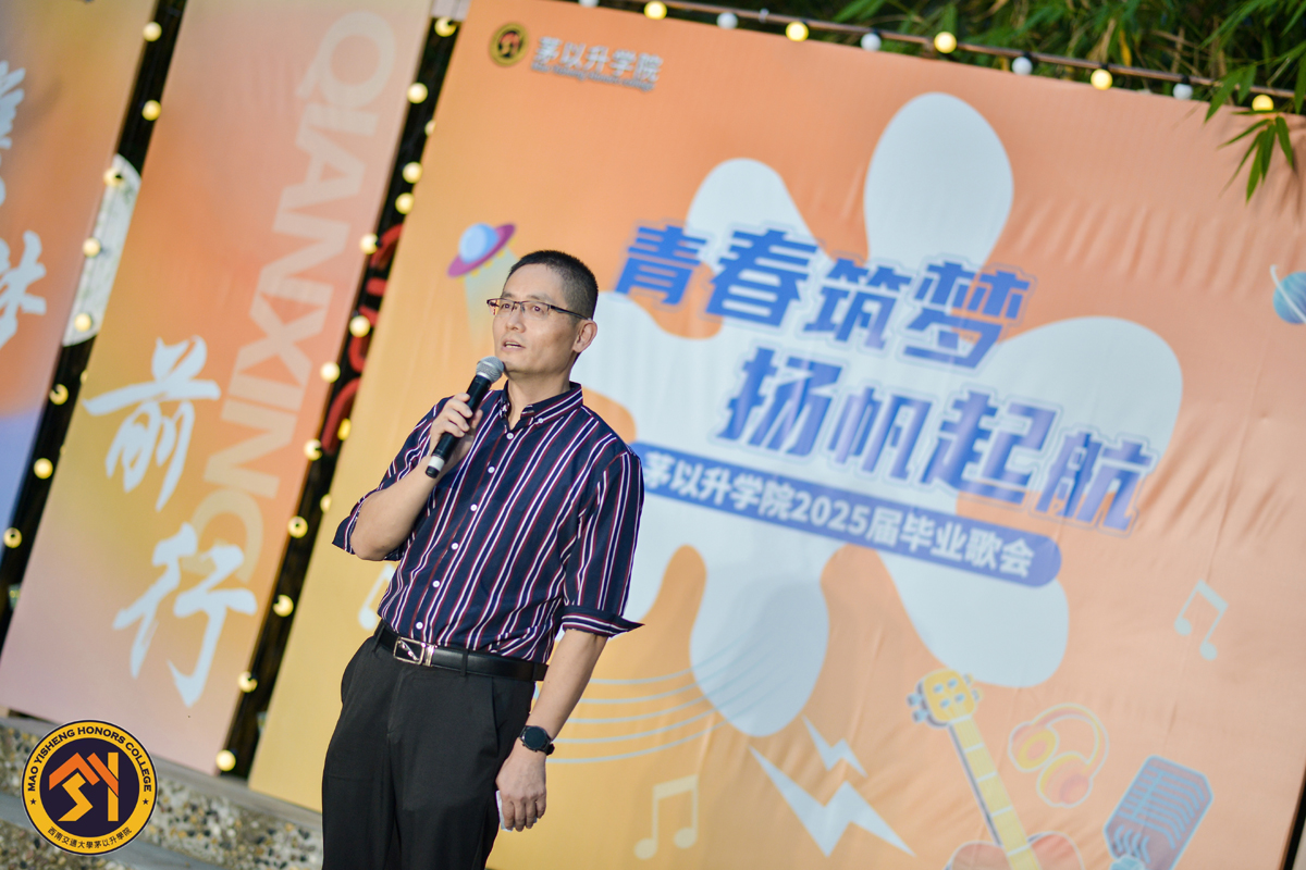 党总支书记李毅为大家带来一段深情告慰和衷心祝福,并带来一首《想和你去吹吹风》。他微哑的声线里氤氲着“风会带走一切短暂的轻松”的温柔劝慰,泪光与微笑在夏夜的晚风中交织成最动人的毕业礼物。